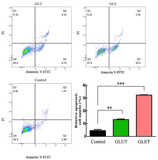 Flow cytometry analysis of PC 12 cells treated by GLUT and GLET. The cells were incubated with GLUT and GLET for 24 h, and the apoptosis was measured via flow cytometry. The number of apoptotic cells in the treatment group was significantly higher than that in the control group. ** p < 0.01, *** p < 0.05.