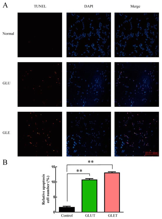 TUNEL staining was performed in PC-12 cells following treatment with GLUT and GLET. The cells were cultured with GLUT and GLET for 24 h and subsequently subjected to TUNEL assay. (A) TUNEL and DAPI staining. Apoptosis was determined by TUNEL staining (Red) and the nuclei were stained with DAPI (Blue). (B) Quantification of TUNEL positive cells. The number of apoptotic cells was substantially higher in the treatment group compared to the control group. ** p < 0.01.