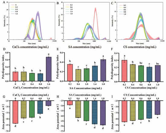 (A,D,G) represented the particle size, PDI and zeta potential of nanoparticles at 0.2–1.0 mg/mL CaCl2, 0.6 mg/mL SA, and 0.4 mg/mL CS; Figure (B,E,H) represented the particle size, PDI and zeta potential of nanoparticles at 0.2–1.8 mg/mL SA, 0.2 mg/mL CaCl2, and 0.4 mg/mL CS; Figure (C,F,I) represented the particle size, PDI and zeta potential of nanoparticles at 0.2–1.0 mg/mL CS, 0.2 mg/mL CaCl2, and 0.4 mg/mL CS. Values with different superscripts indicate significant differences (p < 0.05).