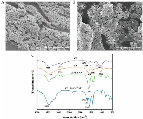 (A) Micromorphology of chitosan-alginate nanoparticles (CS-SA NPs) at 5000×; (B) Micromorphology of chitosan-alginate/CaCl2 nanoparticles (CS-SA/Ca2+ NPs) at 5000×; (C) Fourier-transform infrared (FTIR) spectra of CS, SA, CS-SA NP, and CS-SA/Ca2+ NPs.