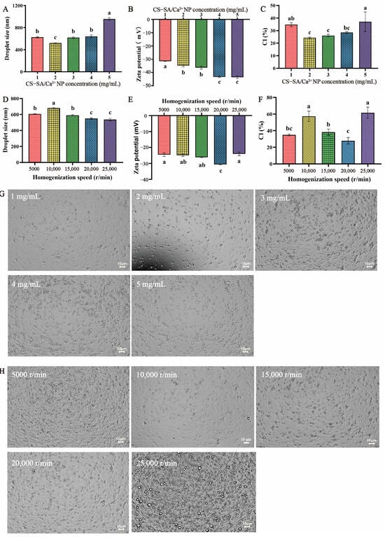 (A–C) Droplet size, zeta potential, and creaming index (CI) of D-limonene Pickering emulsions (PEs) at different CS-SA/Ca2+ nanoparticle concentrations; (D–F) Droplet size, zeta potential, and creaming index (CI) of D-limonene Pickering emulsions (PEs) at different homogenization speed; (G) Optical microscope images of D-limonene Pickering emulsions (PEs) with CS-SA/Ca2+ nanoparticle concentration of 1 mg/mL, 2 mg/mL, 3 mg/mL, 4 mg/mL, 5 mg/mL; (H) Optical microscope images of D-limonene Pickering emulsions (PEs) with homogenization speed of 5000 r/min, 10,000 r/min, 15,000 r/min, 20,000 r/min, 25,000 r/min. Values with different superscripts indicate significant differences (p < 0.05).
