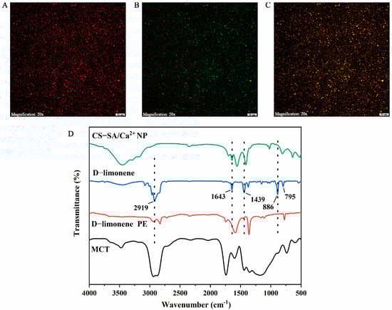 (A–C) The confocal laser scanning microscopy (CLSM) images of the D-limonene PE; (D) Fourier-transform infrared (FTIR) spectra of chitosan/alginate nanoparticle (CS-SA/Ca2+ NP), D-limonene, D-limonene Pickering emulsion (PE), and medium chain triglyceride (MCT).
