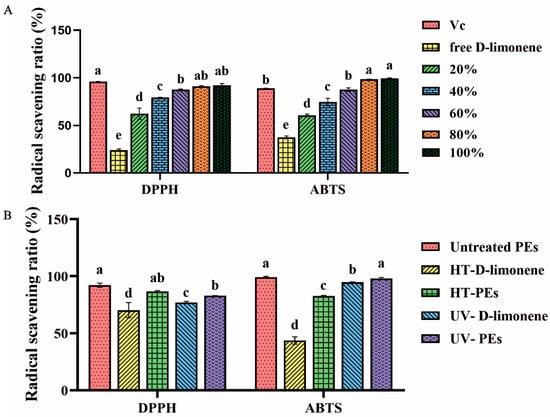 (A) DPPH and ABTS radical scavenging activities of 5 mg/mL vitamin C (Vc), free D-limonene, 20%, 40%, 60%, 80%, and 100% D-limonene PE; (B) DPPH and ABTS clearance rate of untreated PE, high temperature treated D-limonene (HT-D-limonene), high temperature treated PE (HT-PE), UV irradiation D-limonene (UV-D-limonene) and UV. Values with different superscripts indicate significant differences (p < 0.05).