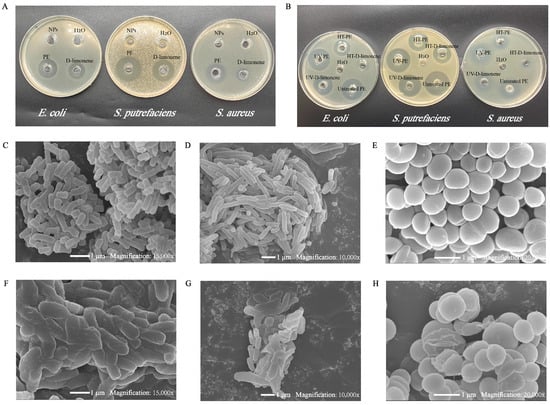 (A) Antibacterial activities of H2O, D-limonene, CS-SA/Ca2+ NPs, and D-limonene PE; (B) Antibacterial activities of untreated PE, HT-D-limonene, HT-PE, UV-D-limonene, and UV-PE; scanning electronic microscope (SEM) images of E. coli (C,F), S. putrefaciens (D,G), and S. aureus (E,H) before and after the D-limonene Pickering emulsion treatment.