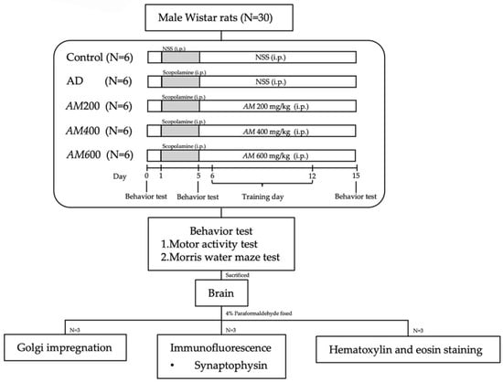 A total of 30 male albino Wistar rats, aged 6 weeks and weighing 150–200 g (BrlHan: WIST@Jcl (GALAS), Nomura Siam International, Bangkok, Thailand) were caged at room temperature (25 °C) with a 12/12-h light/dark cycle and were provided with food and water ad libitum. The experimental protocol was approved by the Animal Ethic Committee of the Faculty of Medicine, Chiang Mai University (approved protocol no., 27/2562). The rats were randomly divided into five groups (six rats per group). The control group received intraperitoneal (i.p.) injections of 1 mL of saline for 15 days. The scopolamine (or AD) group and the other three AM groups received 1 mg/kg of scopolamine (Sigma, Lot no. LRAB7821, St. Louis, MO, USA) for 5 days. Next, the AM200 [20,24], AM400 [20,24], and AM600 groups were treated with the AM leaf extract for 10 days at doses of 200, 400, and 600 mg/kg of body weight, respectively. All animals were tested for their motor and memory behaviors and their hippocampi were investigated for synaptophysin, dendritic spine, and histological features. All the protocols and experiments in this study are shown in Figure 1.