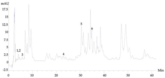 High–Performance Liquid Chromatography profiles of AM extract. Peak 1–6 are cumin aldehyde, gallic acid, euginol, caffeic acid, flavone, and rutin, respectively.