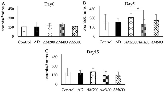 Histograms showing no significant differences in the motor activity among the groups on day 0 (the day before induction; (A)) and day 15 (10 days after AM treatment; (C)). On day 5 (5 days after induction; (B)), the motor activity of the AM200 group showed a significant difference from that of the AM400 group. The data are shown as the mean ± SD; (n = 6), * p < 0.05, analyzed via a one-way ANOVA. AD: Alzheimer’s disease-like symptoms; AM200: Aegle marmelos leaf extract, 200 mg/kg BW; AM400: Aegle marmelos leaf extract 400 mg/kg BW; AM600: Aegle marmelos leaf extract, 600 mg/kg BW.