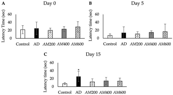 Histogram showing no significant differences between groups in their latency times when finding the hidden platform in the MWM test on day 0 (a day before induction; (A)) and day 5 (5 days after the induction; (B)). On day 15 (10 days after AM treatment; (C)), the latency times of the AD group were significantly higher than those of the control group, while those of the AM200, AM400, and AM600 groups were not different from that of the control group. The latency time data (in seconds) are shown as the mean ± SD; n = 6. * p < 0.05 versus the control group, analyzed via a one-way ANOVA.