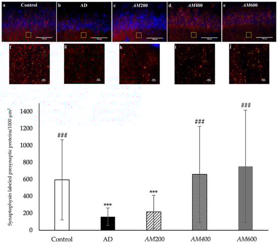 Histograms showing that the synaptophysin density in the CA1 of the AM400 and AM600 groups significantly increased after AM treatment (n = 60, ### p < 0.001 versus the AD group, analyzed via one-way ANOVA). The synaptophysin density of the AD and AM200 groups was significantly lower than that of the control group. The data are shown as the mean ± SD; n = 60, *** p < 0.001 versus the control group, analyzed via one-way ANOVA). The synaptophysin-immunolabeled presynaptic vesicle proteins (red) and the DAPI-labeled nuclei (blue) in the CA1 of the hippocampi of the control (a), AD (b), AM200 (c), AM400 (d), and AM600 (e) groups are arranged in a row above the graph. The systemically selected areas in (a–e) are 1000 µm2, used to analyze the synaptophysin density using the ImageJ program, and their magnifications are shown in (f–j), respectively. Scale bar = 100 µm in (a–e) and 10 µm in (f–j).
