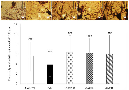 Histogram showing the density of dendritic spines in the CA1 area of the AM200, AM400, and AM600 groups significantly increased after AM treatment (n = 150; ### p < 0.001 versus the AD group, analyzed via one-way ANOVA). The density of dendritic spines in the AD group was significantly lower than that of the control group. The data are shown as the mean ± SD; n = 150; *** p < 0.001 versus the control group, analyzed via one-way ANOVA. The Golgi-stained dendritic spines of the rats in the control (a), AD (b), AM200 (c), AM400 (d), and AM600 (e) groups are arranged in a row above the graph. The selected dendrites used for counting the density of each group are magnified, as shown in the inserted panels. The scale bar is 10 µm in all panels. The scale bars in all inserted panels are 5 µm.