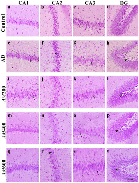 The hematoxylin and eosin-stained histopathological structures of the CA1, CA2, CA3, and dentate gyrus of hippocampi in the AD (e–h), AM200 (i–l), AM400 (m–p), and AM600 (q–t) groups compared to that of the control (a–d). AD: Alzheimer’s disease-like symptoms; AM200: Aegle marmelos leaf extract, 200 mg/kg BW; AM400: Aegle marmelos leaf extract, 400 mg/kg BW; AM600: Aegle marmelos leaf extract, 600 mg/kg BW; CA1: Cornu ammonis 1; CA2: Cornu ammonis 2; CA3: Cornu ammonis 3; DG: Dentate gyrus. Scale bars in all panels = 100 µm (arrow head, vacuolation; arrow, shrunken neuron).