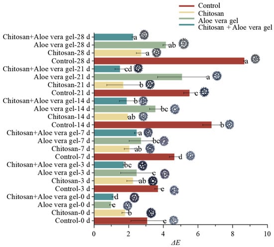 Comparison of the color difference (ΔE) in blue honeysuckle treated with chitosan (CH), aloe vera gel (AL), and chitosan + aloe vera gel (CH+AL) versus the control during 28 days of storage at −1 °C. The lowercase letters indicate significant differences among storage days for each parameter, based on ANOVA test. The different letters (a–e) indicate significant differences between treatments using Duncan’s multiple range test.