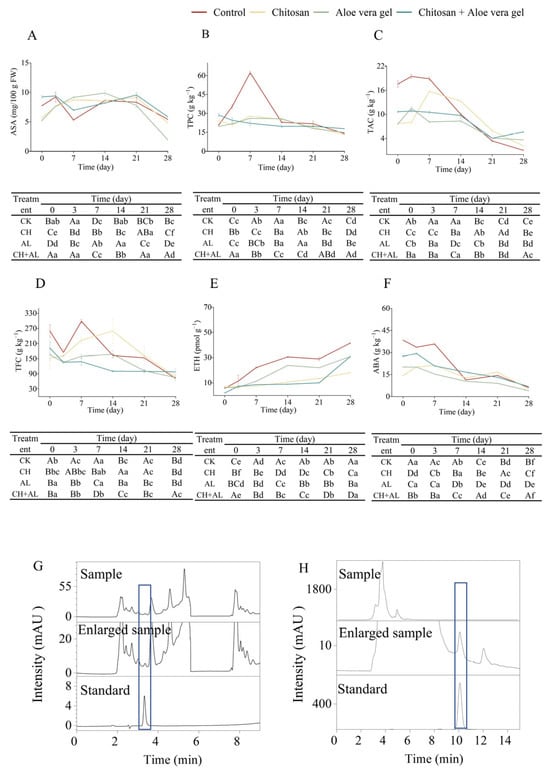 Comparison of ASA (A), TPC (B), TAC (C), TFC (D), ETH (E), ABA (F), ASA chromatogram (Blue rectangle: time-to-Peak force of ASA) (G), and ABA chromatogram (Blue rectangle: time-to-Peak force of ABA) (H) in blue honeysuckle treated with chitosan (CH), aloe vera gel (AL), and chitosan + aloe vera gel (CH+AL) versus the control during 28 days of storage at −1 °C. The upper case letters indicate significant differences among four treatment, and the lowercase letters indicate significant differences among storage days for each parameter, based on ANOVA test.