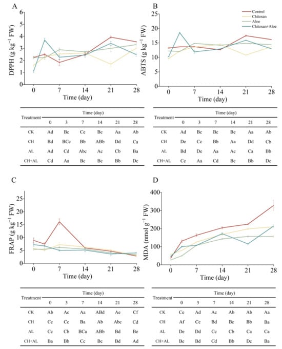 Assessment of DPPH (A), ABTS (B), FRAP (C), antioxidant capacity, and MDA content (D) in blue honeysuckle treated with chitosan (CH), aloe vera gel (AL), and chitosan + aloe vera gel (CH+AL) versus the control during 28 days of storage at −1 °C. The upper case letters indicate significant differences among four treatment, and the lowercase letters indicate significant differences among storage days for each parameter, based on ANOVA test.