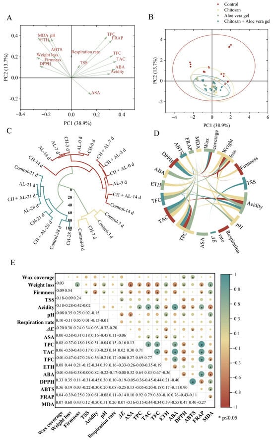 In this study, to comprehensively evaluate the effectiveness of coated treatments on blue honeysuckle during cold storage, a principal component analysis, cluster analysis, and correlation analysis were applied. The relationship between samples and compositional variables was determined using these multivariate statistical analyses. The data collected for the samples were condensed into two principal components, which collectively explained 52.6% of the total variability. Specifically, PC1 accounted for 38.9%, and PC2 accounted for 13.7% of the variability (Figure 4A,B). Samples coated with CH, AL, and CH+AL were positioned in the second quadrant, indicating that the coating treatments were more effective in preserving blue honeysuckle compared to the control. Hierarchical cluster analysis further reinforced that the CH-coated treatment was the most effective, with CH-treated samples at 7 days being closely grouped with the control at day 0 (Figure 4C). To further evaluate the relationships among the measured parameters, a Pearson’s correlation analysis was conducted, with the results presented in Figure 4D,E. Firmness exhibited a positive correlation with weight loss, indicating that increased weight loss contributed to enhanced fruit firmness during storage. ABA demonstrated positive correlations with acidity (r = 0.82), TPC (r = 0.64), TAC (r = 0.83), TFC (r = 0.67), and FRAP (r = 0.76), while it showed a negative correlation with MDA (r = −0.55). These results demonstrate the significant role of ABA in shaping the fruit quality of postharvest blue honeysuckle. FRAP exhibited positive correlations with TPC (r = 0.92), TAC (r = 0.71), TFC (r = 0.69), and ABA (r = 0.76). DPPH displayed a strong positive correlation with ABTS (r = 0.90), but it exhibited negative correlations with TPC (r = −0.36), TAC (r = −0.45), and TFC (r = −0.44). This suggests that antioxidant capacity is closely linked to metabolites. Additionally, MDA displayed a negative correlation with FRAP. These results collectively highlight that the senescence of blue honeysuckle is accompanied by an increase in ROS levels and a decrease in overall quality. This is in line with the findings of Li et al., who reported a similar correlation between ROS metabolism and fruit senescence in postharvest bracken [].