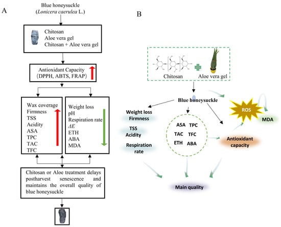 The mechanism diagram of coated blue honeysuckle, text version (A), and drawing version (B) illustration of the potential mechanism behind the edible coating treatments using CH and AL solution, which delay postharvest senescence and maintain the overall quality of blue honeysuckle by regulating the ROS metabolism. Red arrows represent promotional effects, while green arrows represent inhibitory effects.