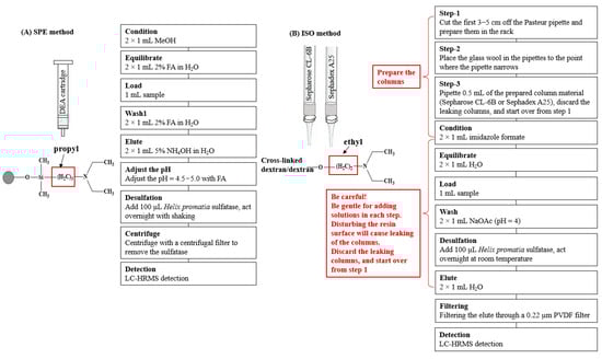 Scheme of (A) the SPE method and (B) the ISO method. FA, formic acid; MeOH, methanol; NH4OH, ammonium hydroxide; and NaOAc, sodium acetate.