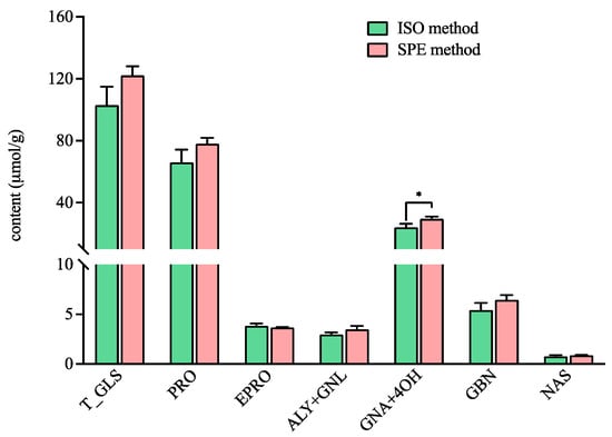 The contents of the total and individual glucosinolates in the certified rapeseed ERM-BC367 reference using the ISO and SPE methods. Total glucosinolates (T_GLS); progoitrin (PRO); epiprogoitrin (EPRO); glucoalyssin (ALY); gluconapoleiferin (GNL); gluconapin (GNA); 4-hydroxyglucobrassicin (4OH); glucobrassicanapin (GBN); and gluconasturtiin (NAS). * significantly different (p < 0.05) as determined via a paired t-test.