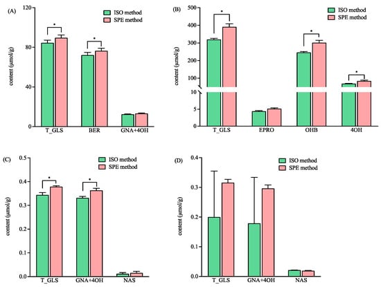 For the variety WT04, the contents of hydroxybenzyl glucosinolate (OHB) and 4-hydroxyglucobrassicin (4OH) detected by the SPE method were significantly higher than that detected by the ISO method (Figure 3B). In the variety BN01, gluconapin (GNA) and 4-hydroxyglucobrassicin (4OH) were not fully separated in the chromatogram, and their content were calculated combined. The total content of the GNA and 4OH detected by the SPE method was significantly higher than that detected by the ISO method (Figure 3C). In Hua01, better precision was obtained with the SPE method for the total GLSs, GNA, and 4OH (Figure 3D). In addition, the GLS profiles were found to be variety-dependent (Figure 3). This agreed with the previous report that mustard seeds show different glucosinolate profiles based on their varieties [29].