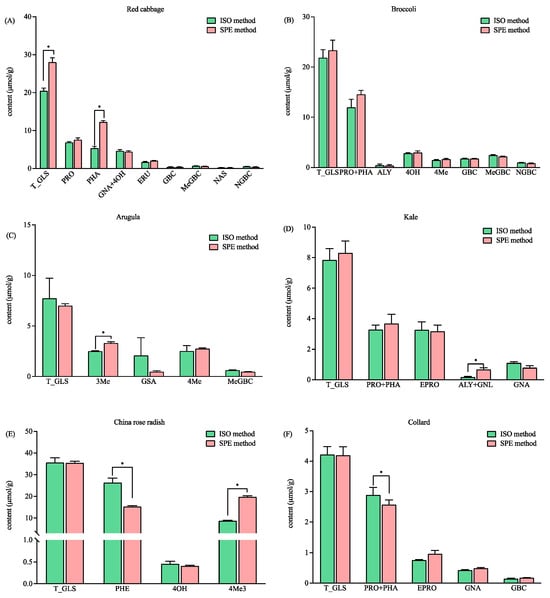 The contents of the total and individual glucosinolates in six vegetables using the ISO and SPE methods. (A) Red cabbage; (B) broccoli; (C) arugula; (D) kale; (E) China rose radish; and (F) collard. Total glucosinolates (T_GLS); progoitrin (PRO); glucoraphanin (PHA); gluconapin (GNA); 4-hydroxyglucobrassicin (4OH); glucoerucin (ERU); glucobrassicin (GBC); methoxyglucobrassicin (MeGBC); gluconasturtiin (NAS); neoglucobrassicin (NGBC); glucoalyssin (ALY); 4-Methylthiobutyl glucosinolate (4Me); 3-Methylsulfinylbutyl glucosinolate (3Me); glucosativin (GSA); gluconapoleiferin (GNL); glucoraphenin (PHE); 4-methylthio-3-butenylglucosinolate (4Me3); and epiprogoitrin (EPRO). * significantly different (p < 0.05) as determined via a paired t-test.