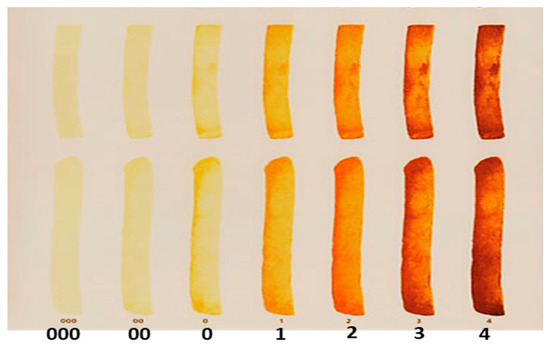 The color of a food’s surface is paramount because it is the first parameter evaluated by consumers, therefore, determining its acceptance even before it enters the mouth [31]. Regardless of the method of preparation of ready potato snacks, they should be light and golden, without brown discoloration, black streaks, or stains [16,17,32]. According to the European Potato Processors Association, the acceptable color for fried potato products is a light golden color (corresponding to No. 0 on the USDA Munsell color chart) or golden yellow (corresponding to No. 1 on the USDA Munsell color chart), as shown in Figure 1 [33]. Although this chart (Figure 1) was designed to evaluate the color of French fries, it has also been used successfully to assess the color of potato chips [34]. This approach is empirical and largely subjective depending on the user.