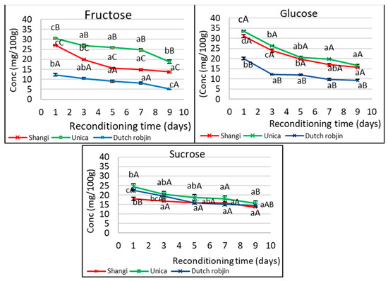 Changes in the concentration of glucose, fructose, and sucrose in cold-stored potato tubers after reconditioning at room temperature (22 ± 3 °C for 9 days). Different lower-case letters indicate significant differences across the days in reconditioning while upper-case letters indicate significant differences across the varieties based on Bonferroni’s means separation test at a 5% level of significance.