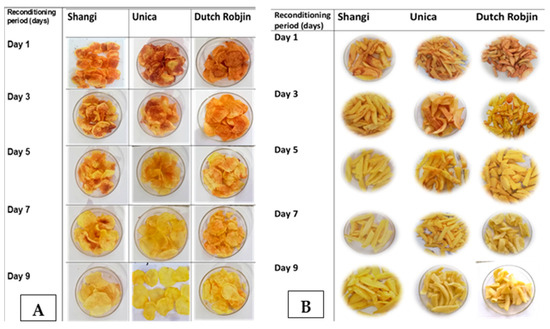The consumer acceptability of potato chips and French fries is largely dependent on the color after frying [52]. Moreover, the color control of final fried potato products is recommended not only for consumer acceptability (appearance and sensory quality) but also to reduce acrylamide formation [6]. The color of fried potato products serves as an indicator of the extent of the Maillard reaction, which contributes to the formation of acrylamide. Lighter-colored products are generally perceived as more acceptable and safer due to lower acrylamide levels, whereas darker-colored products signify a higher degree of acrylamide formation and may raise concerns regarding safety [16,53]. Figure 4 shows the evolution of the color of potato chips and French fries as affected by reconditioning for 9 days. It is evident that the potato chips and potato fries became generally desirable after 5 days of reconditioning, and this was variety-dependent.