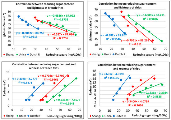 The coloration of fried potato products is said to be influenced by several variables including growing conditions, tuber moisture content, and the frying time and temperature, but the sugar content stands out [9,58]. With increasing reducing sugar content in potatoes, the color of fried products deteriorates towards brown, and the acrylamide content also increases [53]. In this study, a strong negative correlation (r < −0.93) was observed between the reducing sugar concentration and lightness values of French fries and potato chips within the reconditioning time for all the potato varieties (Figure 5). The coefficient of determination indicated that reducing sugar concentration accounted for 87.3–97.1% of the variation in the L* parameter of French fries and 91.1–98.4% in potato chips. On the other hand, reducing sugar content was found to be positively correlated with the redness (a*) value of French fries (r > 0.92) and potato chips (r > 0.88). The coefficient of determination between reducing sugar content and the a* values ranged from 84.7 to 95.5% in French fries and 77 to 88.3% in chips. Jin et al. and Zommick et al. [38,59] reported that reconditioning cold-stored potatoes led to a reduction in their reducing sugar content and substantially improved the L* and a* values of potato-based products. These parameters are important because they are not only linked to flavor and appearance but also to the safety of fried potato products [16]. These results point to the fact that the reducing sugar content of cold-stored potatoes is a critical control factor for determining the quality of potato-based products.