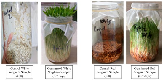 Germination was accomplished as determined by [] with some modifications. Ungerminated red and white sorghum grains were designated as Control Groups and labeled as CR and CW, respectively. Approximately 100 g of sorghum samples were rinsed three times with distilled water (1 min each). After that, the grains were soaked in distilled water at a ratio of 1:1 (sample to water) and soaked for 12 h at ambient temperature (23–25 °C). Thanks to soaking, the microbial load was decreased, and the grain moisture level was optimized between 35% and 40%, which is suitable for germination. Following the filtration of the soaking water, the Soaked Control Groups were labeled as SCR and SCW (Soaked Control Red and White Sorghum). Subsequently, the soaked samples underwent a germination process for a duration of 7 days, with sampling conducted every 24 h. During germination, the grains were moistened with water once a day. The samples taken from different intervals of germination were lyophilized. After lyophilization, the germinated and ungerminated (control) samples were milled in an analytical hammer mill (Brabender Laboratory Mill, (Duisburg, Germany) equipped with a sieve aperture of 500 μm. The samples were packed hermetically and finally stored at a refrigerator temperature (+4 °C) until further analysis. The germination process for each sorghum sample was performed in two replications.