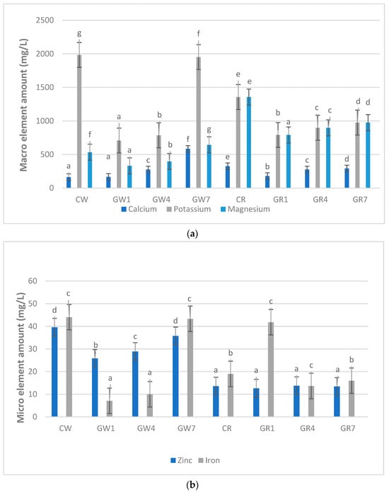 White- and red-colored sorghum samples were analyzed in terms of macro- (calcium, potassium and magnesium) and microelement (iron and zinc) amounts following a 7-day germination period, and the results are given in Figure 2.