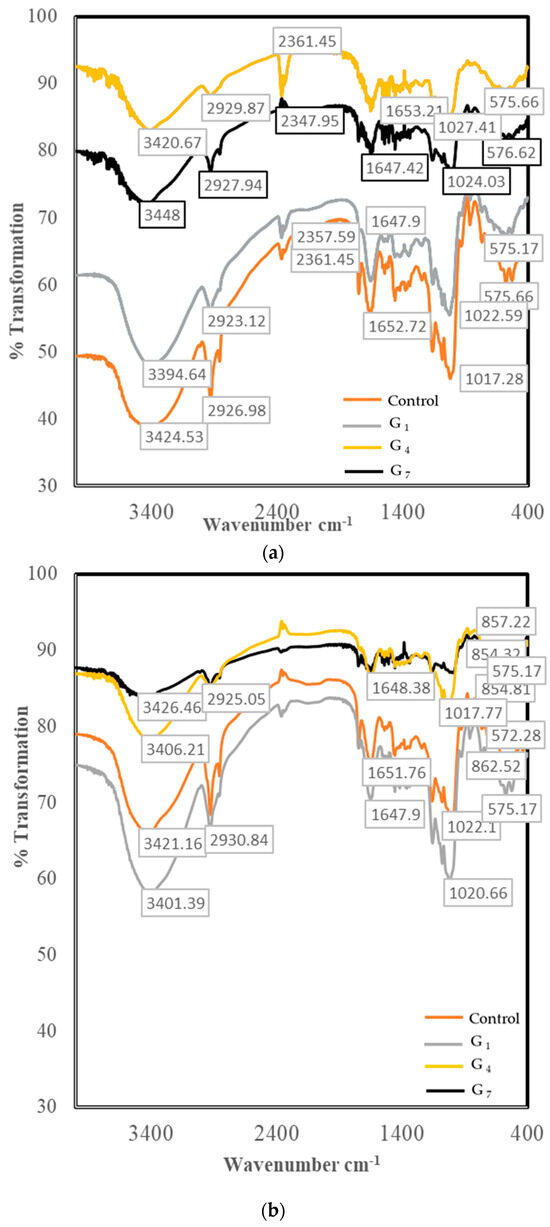 The study data for the determination of the molecular structure of sorghum flour using the FT-IR method revealed the existence of important active regions in the wavenumber range of 1800 to 800 cm−1. While FT-IR peaks reveal starch and proteins as the most basic components in sorghum, lipids and phenolic acids are characterized by peaks showing much lesser amounts (Figure 3) [].