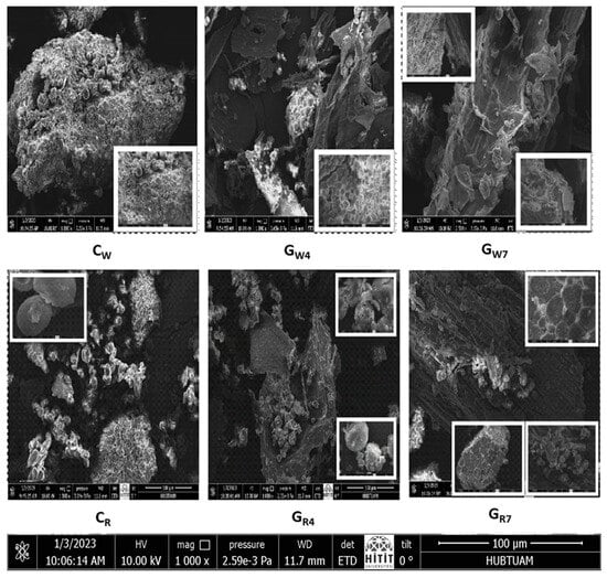 SEM images of white and red sorghum samples during germination process. Cw: Control White Sorghum, GW4: Germination Sorghum White 4th day, GW7: Germination Sorghum White 7th day, CR: Control Red Sorghum, GR4: Germination Sorghum Red 4th day, GR7: Germination Sorghum Red 7th day.