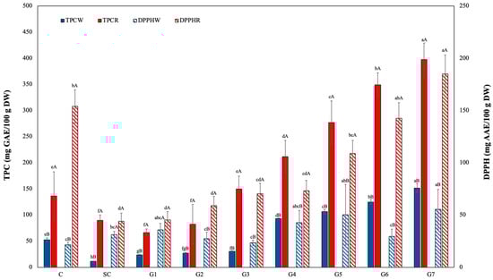 Effects of germination on total phenolic and antioxidant activity of sorghum samples. a−f: Lowercase letters indicate the effect of germination time on the TPC and DPPH value. Means followed by the same letter do not differ significantly at p = 0.05 according to Tukey multiple ranges; A−B: capital letters indicate the effect of sorghum variety at the same germination time. Means followed by the same letter do not differ significantly at p = 0.05, according to the t-test.