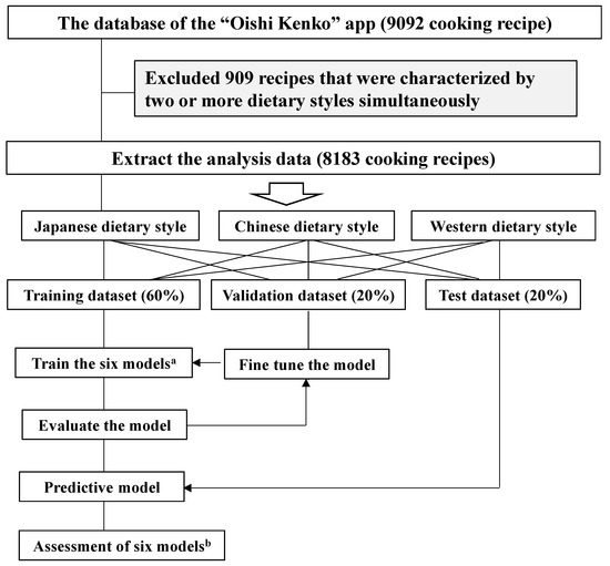Current Japanese dietary styles are diverse and challenging to classify. Even nutrition specialists, such as dieticians, do not have a standard for defining dietary styles. One review reported the difficulty in defining the Japanese diet because consistent definitions have not been established [19]. The present study refers to traditional Japanese, Japanese–Chinese, and Japanese–Western diets as Japanese, Chinese, and Western diets for good legibility. It is necessary to develop a complementary tool for classical methods to identify evidence-based dietary styles. Such a prediction model would support researchers in properly naming dietary patterns resulting from classical methods. Moreover, such a study can contribute to preserving the Japanese dietary style by identifying the understandable characteristics of this diet. Therefore, this study aimed to develop a machine learning model for classifying cooking recipes into Japanese, Chinese, and Western dietary styles in Japan.