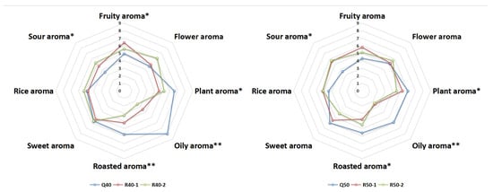 - Li, H.; Zhang, X.; Gao, X.; Shi, X.; Chen, S.; Xu, Y.; Tang, K. Comparison of the Aroma-Active Compounds and Sensory Characteristics of Different Grades of Light-Flavor Baijiu. Foods 2023, 12, 1238. [Google Scholar] [CrossRef]