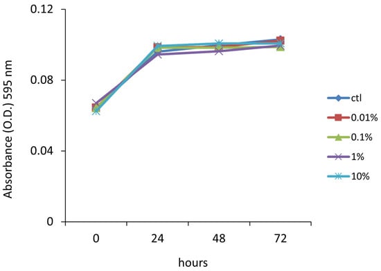 The cellular metabolic activity of human primary gingival fibroblast (HGF-1) cells exposed to increasing concentrations of ovine whey (0.01%, 0.1%, 1%, 10%) was measured by MTT assay as described in Chiarella et al. (2019) [27]. Briefly, 5 × 103 cells were plated in quadruplicate on 96-well plates in 100 μL of complete growth medium with or without ovine whey. Cell viability was monitored for 72 h by adding 10% MTT solution (working concentration 0.5 mg mL) to each well every day. Cells were incubated with MTT reagent at 37 °C for 2 h and eventually isopropanol acidified with HCl; 0.08 N was added by pipetting up and down to dissolve the formazan crystals. The absorbance was determined at optical density of 595 nm with a microplate reader, Glomax (Promega, Milan, Italy).