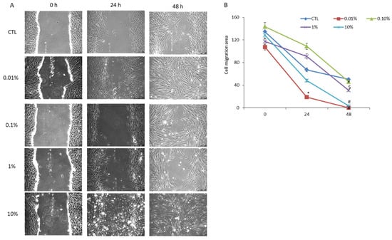 Since sheep whey does not affect cell proliferation, it is possible to decouple proliferation and migration effects. Specifically, a scratch was performed on a confluent monolayer of human primary gingival fibroblasts, and then the cells were treated with ovine whey at different concentrations (0.01, 0.1, 1, and 10%) for 48 h. The outcomes showed that ovine whey has the capacity to accelerate wound healing in vitro in a dose- and time-dependent manner. Intriguingly, the HGF-1 migratory capability was still evident in the cell culture exposed to 0.01% and 10% ovine whey for 24 h (Figure 2). In these cases, the percentage of wound closure increased by 3.73-fold and 1.39-fold, respectively, compared to control cells in the same period. However, the wound was completely healed in the cells treated with 0.01% and 10% ovine whey for 48 h.