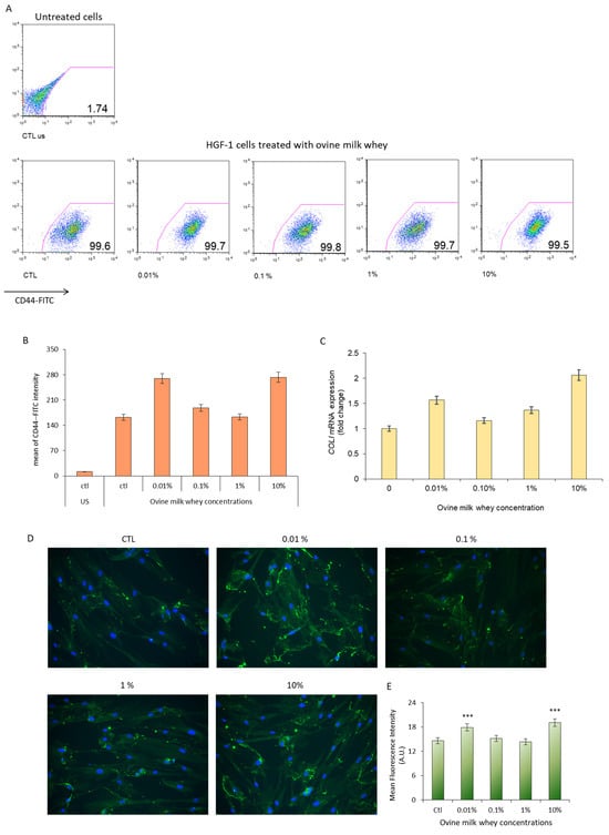 Ovine milk whey stimulates extracellular matrix deposition in HGF-1 cells. (A) CD44 expression was evaluated by FACS analysis in HGF-1 cells treated with 0.01%, 0.1%, 1%, and 10% ovine milk whey for 48 h. (B) The mean fluorescence intensity of CD44-FITC-positive cells was calculated by FlowJo software. (C) The mRNA levels for COLI were measured by q-RT-PCR in HGF-1 cells exposed to different concentration of ovine milk whey. (D) Representative images of Collagen I staining after treatment with ovine milk whey for 24 h. Collagen fibers, stained in green, were highly diffused in HGF-1 cells exposed to 0.01% and 10% ovine milk whey. Nuclei are stained in blue. (E) The mean fluorescence intensity was calculated on three images using a macro in ImageJ software. Data are presented as the mean ± standard deviation. Statistical analysis was performed using Student’s t-test in Microsoft Excel (*** p ≤ 0.0001).