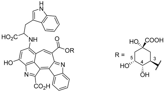 After Moccia et al. [15] had described two red compounds based on cyanines, our own studies demonstrated the formation of different red products consisting of one equivalent of chlorogenic acid with the quinic acid still attached and two equivalents of tryptophan [16]. The structure of the predominant compound is shown in Figure 1. Because the focus of that study was on the structural elucidation of the pigment and the proposal of a formation pathway, no investigations into the physicochemical properties and stability were performed. Furthermore, the formation of the pigment required a reaction time of 72 h, which is not acceptable in terms of economic production. Therefore, the aim of the present study was to develop a process for the accelerated generation of the red colorant and to characterize its physicochemical properties, such as solubility in various solvents and stability against heat and light. In addition, the colorant was used in select food systems to evaluate its application potential.