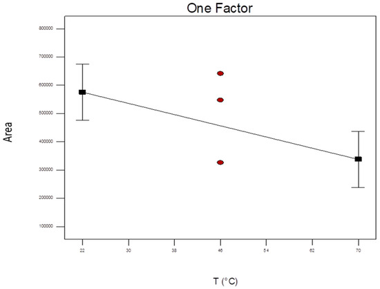 The one-factor plot of the factorial screening design shows that temperature has a significant linear and negative effect on the peak area of the red pigments (Figure 2). Concomitantly, the formation of a brown color hue at the cost of the red color was observed when the reaction was performed at higher temperatures. This may be explained by the preferred oxidation of chlorogenic acid and subsequent reactions of the quinone to high-molecular compounds before condensation with Trp to form the red pigment takes place [17]. From these findings, it can be concluded that in a range of 22–70 °C, there is a negative effect and, therefore, that the reaction should preferably be carried out at room temperature. While it might be of interest to test temperatures below this range, it needs to be considered that cooling would be required, which would entail additional energy costs and might compromise the feasibility of the process.