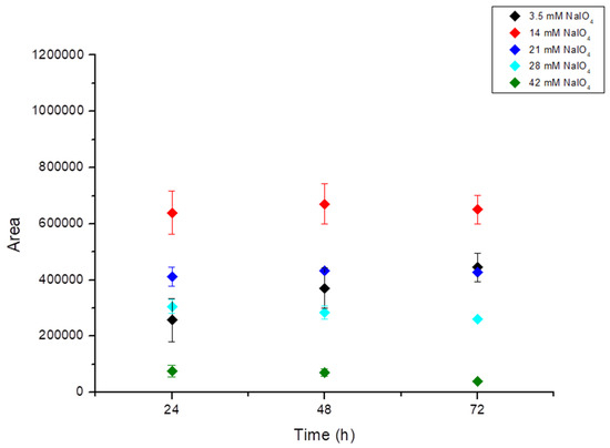 Variation of total peak area at 550 nm as a function of concentration of NaIO4 after 24, 48, and 72 h reaction time.