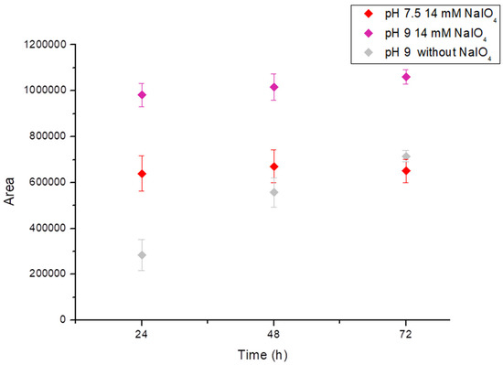 Total peaks area at 550 nm after 24, 48, and 72 h in the presence of 14 mM of NaIO4 (1 M equivalent) in Tris buffer 0.2 M at pH 7.5, at pH 9, and at pH 9 without the use of NaIO4.
