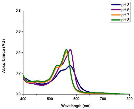 The stock solution prepared in Section 2.5 was diluted (1:100; v/v) in 0.1 M phosphate buffer at pH 7 and 8 and in 0.1 M acetate buffer (pH 3 and 5). The absorbance of the solutions was determined by UV/Vis spectrophotometry in the range from 400 to 800 nm.