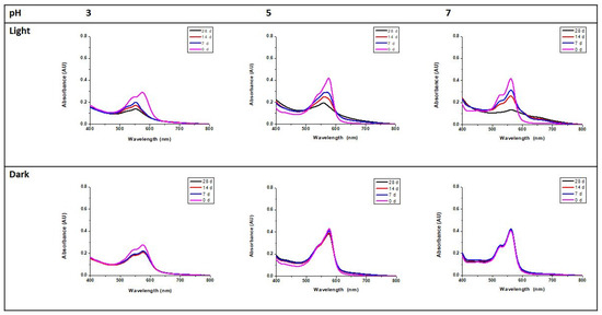 UV-Vis absorption spectra of solutions of the hydrolyzed pigment at different pH values and times (0/7/14/28 d) after exposure to light or dark.