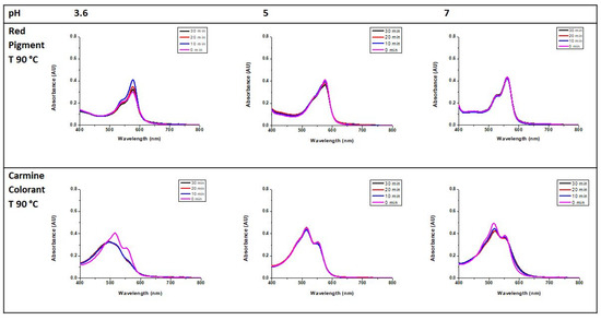For the determination of the thermal stability, the stock solution prepared as described in Section 2.5 was diluted 1:100 (v/v) in 0.1 M phosphate buffer at pH 7 and in 0.1 M acetate buffer at pH 3.6 and 5 (0.029 mg/mL) and placed in capped vials. These were sealed with parafilm, kept at 90 °C for 30 min, and periodically analyzed by UV-Vis spectroscopy at 10-min intervals. For comparison, the thermal stability of a commercial carmine colorant (0.059 mg/mL) was determined using the same procedure.
