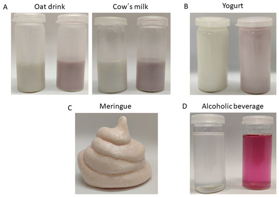 Cow’s milk was selected as a model system because of its high commercial importance and tendency to be accepted with a reddish color, for example, when red berries such as strawberries are added. Plant-based drinks such as oat drinks are considered milk alternatives and have attracted increasing attention from consumers who wish to avoid animal-derived foods. Our studies revealed that the novel pigment produced excellent results for these specific applications, inducing a homogeneous color hue. Also, yogurt proved to be a suitable matrix because no precipitation occurred, and good pigment stability was observed under moderately acidic conditions. Finally, a potential use for an alcoholic beverage was proposed in light of the increased demand for drinks with vivid colors achieved by adding pigments, which appeal to a broad consumer base. Color stability in the samples was monitored for 28 days with CIELAB color space, with the exception of meringue, which was evaluated only for 14 days because of its limited storage stability. During this period, no significant changes in the a* values were observed (Table S4).