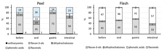 Flavan-3-ols represented 35% to 73% (peel) or 33% to 55% (flesh) of the phenolic compounds in different phases of digestion (Figure 1).