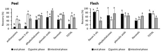 Recovery of phenolic classes from peel and flesh after oral, gastric, and intestinal phases of digestion. The values with different letters are significantly different according to the post-hoc Tukey test (p < 0.05), with letters a to b ordered from highest to lowest.