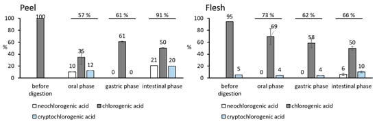 Phenolic acids contributed to 5–13% (peel) and 41–57% (flesh) of the total phenolic compounds found in different phases of the digestion (Figure 1).