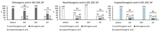 Similarly, cryptochlorogenic acid showed isomerization. It isomerized in SSF and SIF into neochlorogenic acid (29% and 20% in SSF and SIF, respectively) and chlorogenic acid (17% and 13% in SSF and SIF, respectively). Only 69% and 48% of the initial amount was recovered in SSF and SIF, respectively, in the form of the parent compound and isomers, which again suggests the degradation of cryptochlorogenic acid into unknown products at a higher pH of the SSF and SIF. There was no isomerization of cryptochlorogenic acid in SGF at the lower pH.